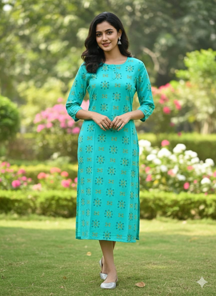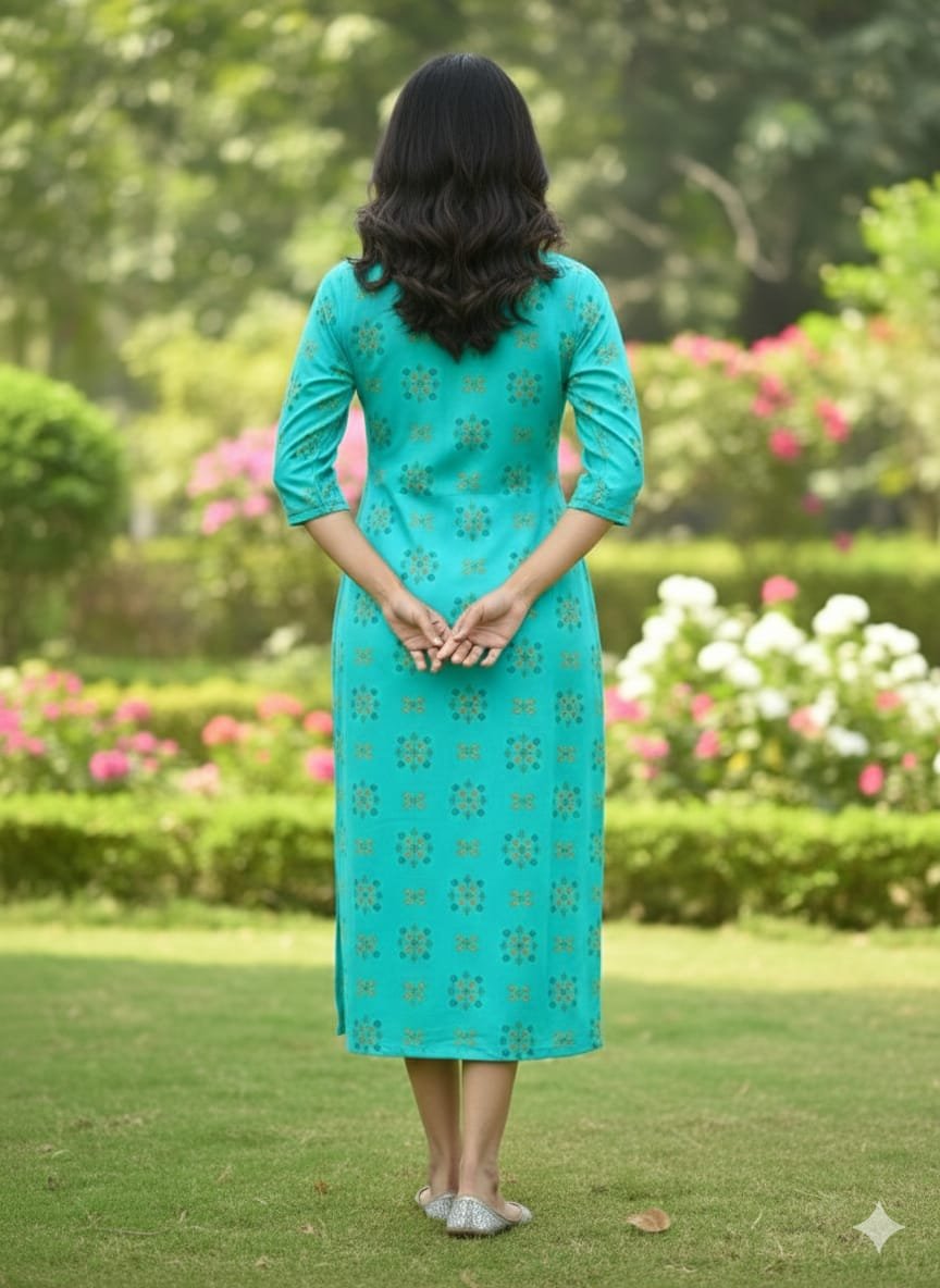 Beautiful Regular FitĀ  Aqua blue printed kurti, with side Pocket , No shrinkage.