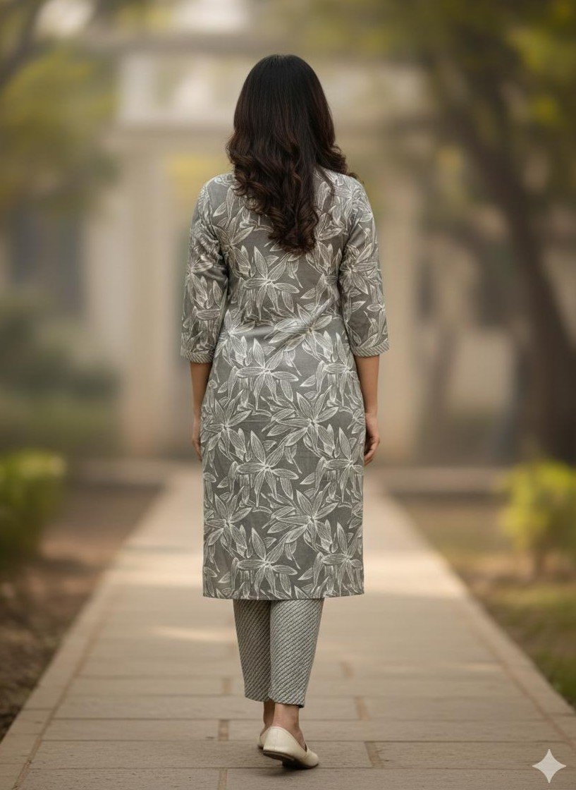 Step into effortless style and comfort with our Beautiful Grey Embroidered Regular Fit Kurta with ankle-length pants, designed for the modern woman who values both fashion and functionality. This chic ensemble features a soft, breathable top paired with ankle-length pants that come with practical side pockets for added convenience. Made from Rayon fabric, it ensures all-day comfort with no shrinkage, maintaining its perfect fit and shape wash after wash. Ideal for casual outings, travel, or relaxed workdays, this Kurti-set offers a sleek, contemporary look that keeps you feeling confident and comfortable.