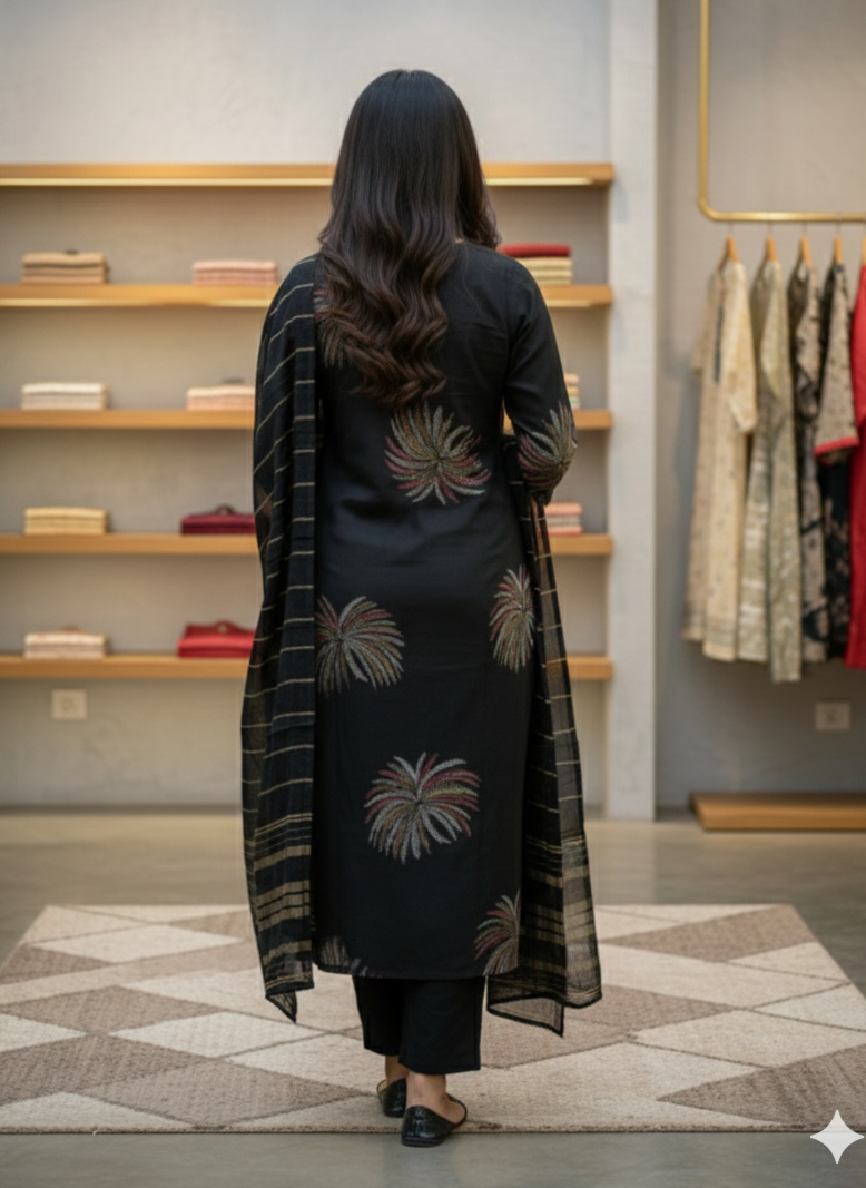Fabric & Color: Crafted from a high-quality matte fabric—likely a cotton-silk blend or fine Chanderi—in a deep onyx black.