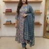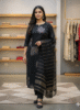 This is a three-piece Salwar Kameez set in a sophisticated midnight black. The look is defined by its minimalist aesthetic, elevated by artistic hand-painted or embroidered floral motifs and a structured, metallic-accented dupatta.