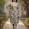 Design Details: The kurta features a straight-cut silhouette with three-quarter sleeves. It is adorned with striking, oversized burst-style floral motifs (resembling fireworks or spider lilies) in muted shades of silver, dusty rose, and sage green.