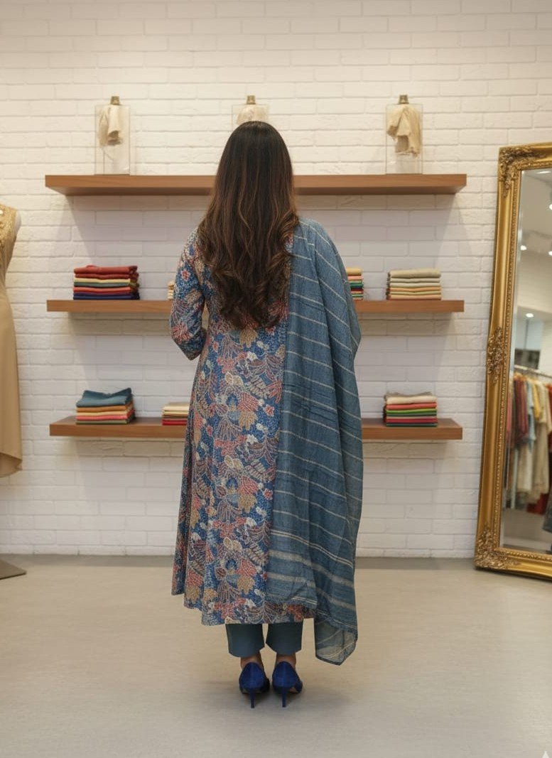Step into effortless style and comfort with our Multi-colored Anarkali Kurta With Trouser & Dupatta, This is a sophisticated and elegant three-piece Salwar Kameez set in a deep Multi-colored. Â The outfit balances traditional silhouettes with contemporary minimalist prints, making it ideal for semi-formal gatherings or festive daytime events.