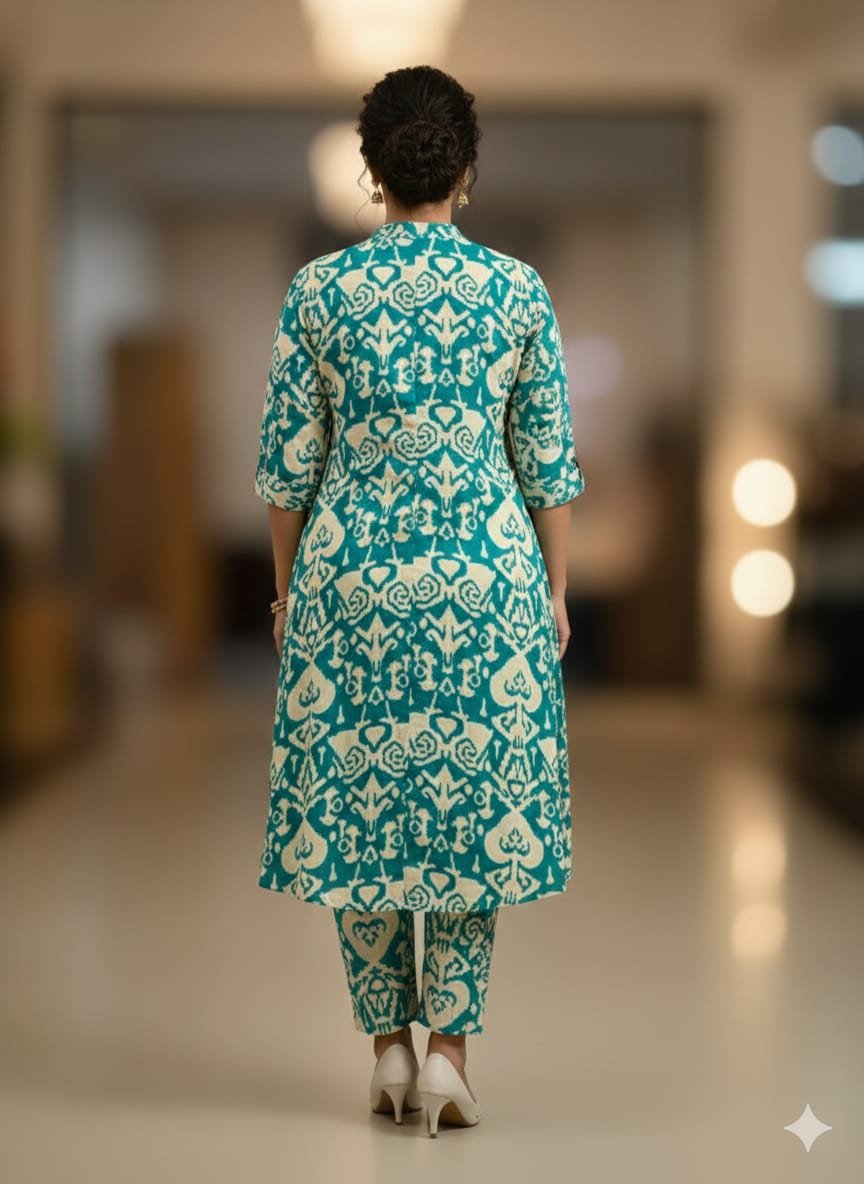 - Design & Print: Features an intricate all-over ikat or ethnic print in a sophisticated teal and off-white colour palette.