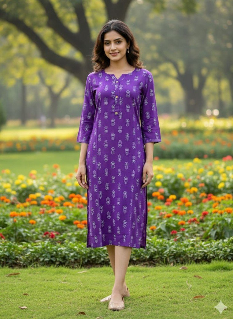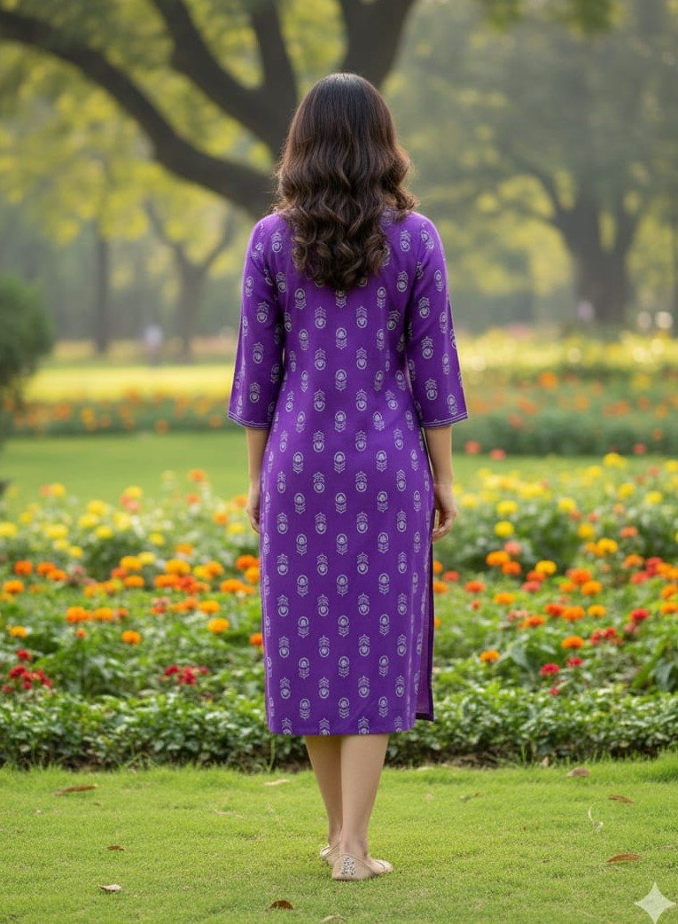 Beautiful Purple Printed Straight-Fit Kurta with side Pocket , No shrinkage.