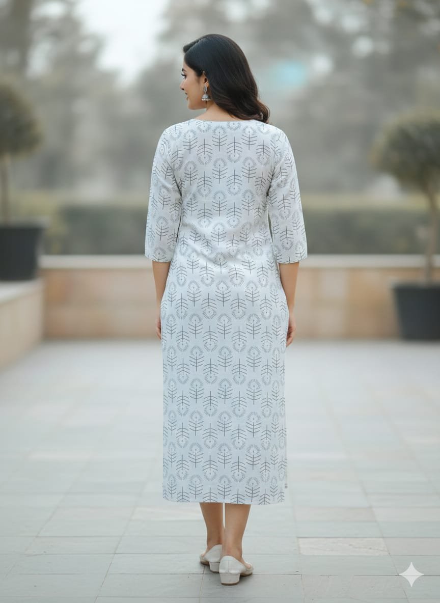 The dress in the image is a white printed straight-fit kurta, which is a type of Indian tunic. It typically features a round neckline and three-quarter sleeves.